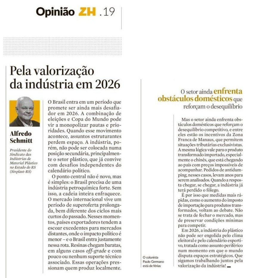 Começamos 2026 com um debate essencial no centro da pauta. Logo no primeiro dia do ano, o artigo do presidente do Sinplast-RS Alfredo Schmitt, “Pela valorização da indústria em 2026”, foi publicado pelo Jornal Zero Hora, trazendo uma reflexão necessária sobre os desafios estruturais da indústria brasileira — em especial do setor plástico — em um ano marcado por eleições,...